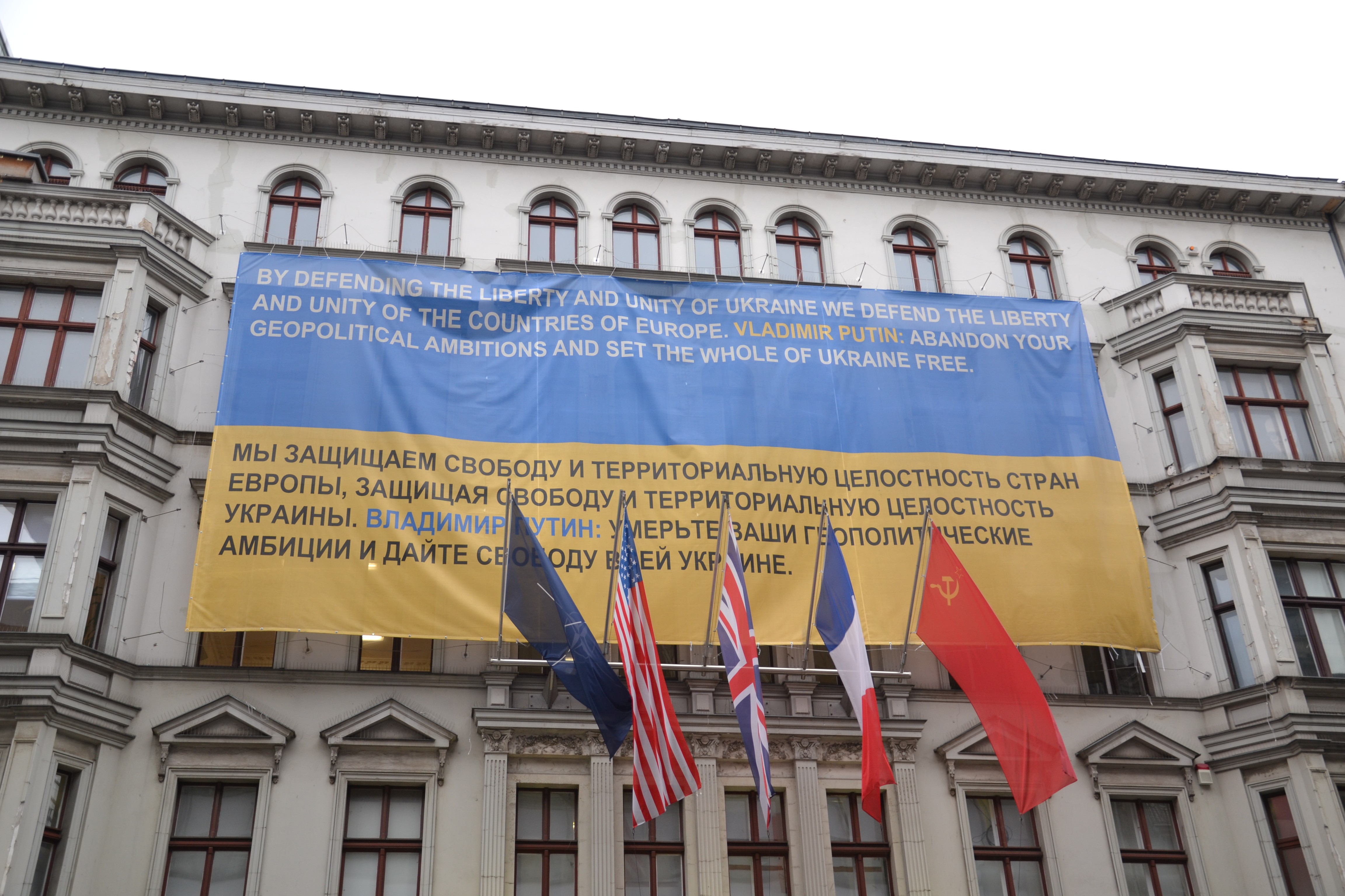 Нині поруч із Чекпоінтом “Чарлі” вивішено величезний плакат у вигляді українського прапора. Цей плакат було вивішено ще у 2015 році, нібито з ініціативи керівниці музею, яка є українкою за походженням. Імовірно, це пояснює одночасне послання на прапорі і Путіну, і Заходу.